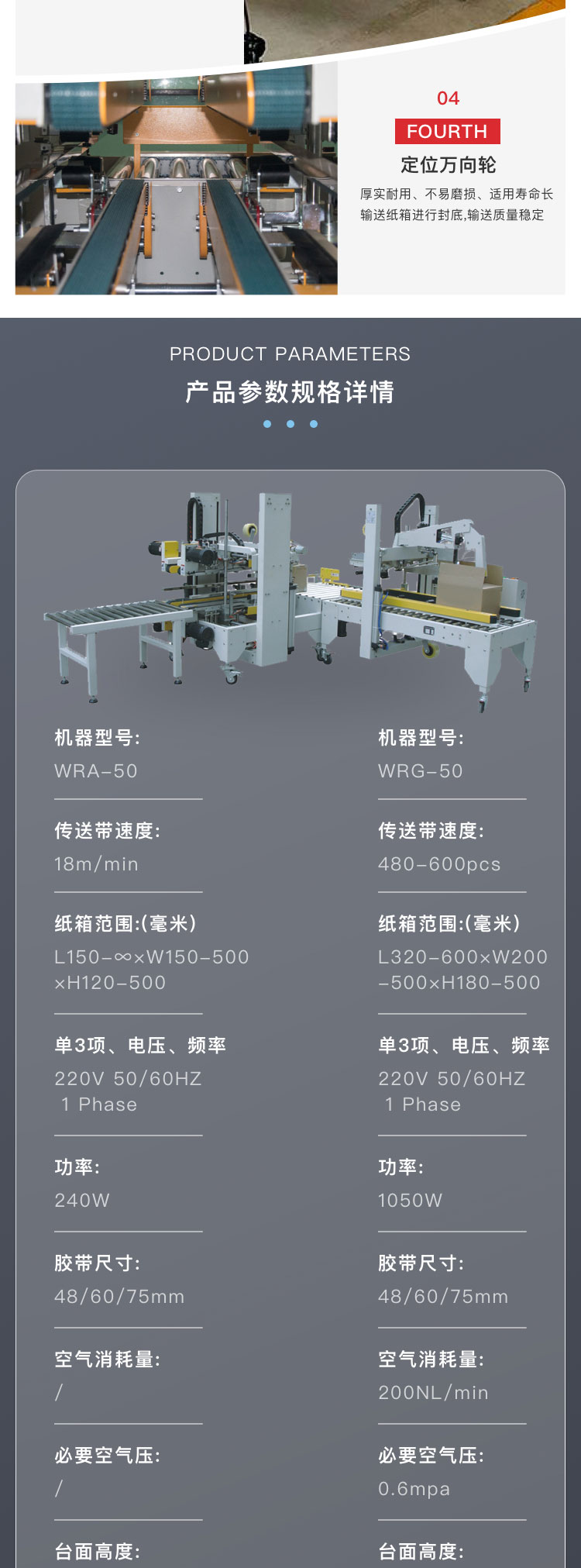 介紹:自動四角邊封箱機WRA-50-WRG-50工型封箱機的成功研發(fā),填補了封箱機在面對特別行業(yè)需進行角邊封箱空缺特別是針對與電子產(chǎn)業(yè)和需走海運的行業(yè),90°轉(zhuǎn)角機,氣缸自動推箱;紙箱上下四個角邊同時自動封箱,可與GPA/GPB/GPC機型聯(lián)機組合完成工字型封箱機。該款封箱機廣泛應(yīng)用于食品、日化、電子等行業(yè)。 產(chǎn)品別稱:全自動封箱機、工字封箱機、一字封箱機、十字封箱機、四角邊封箱機、上下驅(qū)動封箱機、左右驅(qū)動封箱機、快遞封箱機、電商封箱機、膠帶封箱機、快速封箱機、可調(diào)封箱機、伺服封箱機