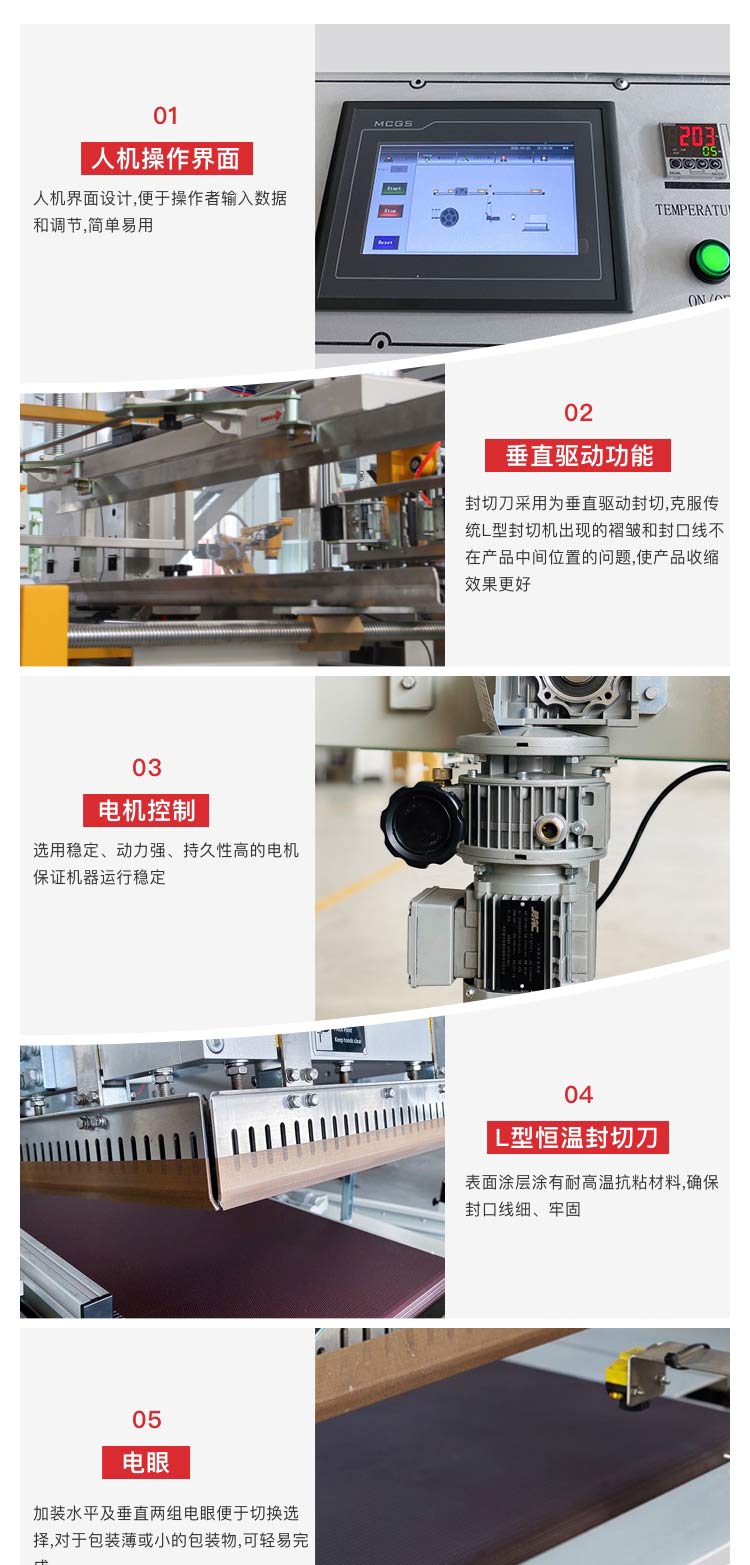 介紹:全自動L型垂直上下封切收縮機是在L型封切收縮包裝機的基礎上升級改造的一款設備,主要針對較高、較薄的產(chǎn)品封切收縮,可自動完成送料、套膜、封切、收縮等步驟,保證其封口線處于中間位置,每分鐘產(chǎn)量可達15-40件,適合POF膜和膠聯(lián)膜,自動吹膜,封口線細,整齊。該款封切收縮包裝機在化妝品行業(yè)應用廣泛,也適用于印刷、彩盒、日化、汽配、五金、食品等行業(yè)。