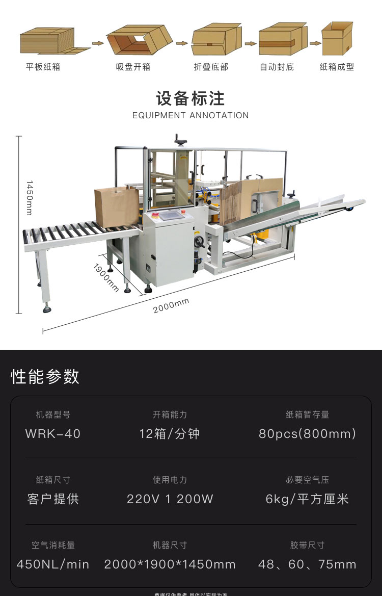 介紹:紙箱自動成型封底機WRK-40立式開箱速度達到12箱/分鐘的開箱機,與同級別立式開箱機相比價格低50% 01: 紙箱自動成型機采用獨立技術制造,并選用進口零部件,電器元件及氣動元件;采用立式儲存紙板方式,并可隨時補充紙箱板,不需停機 02: 封底機合理化設計,同步吸取成型,招底與封底一次同步成型;體積經巧,機件性能精密,運作過程無振動,運轉穩國壽命長,效率高 03: 適用于同一時間同種紙箱尺寸包裝使用,如需變換紙箱規格,手動調節即可,所需時間1-2分鐘, 04: 加裝適明有機玻璃防護罩,開門自動停止,避免操作意外
