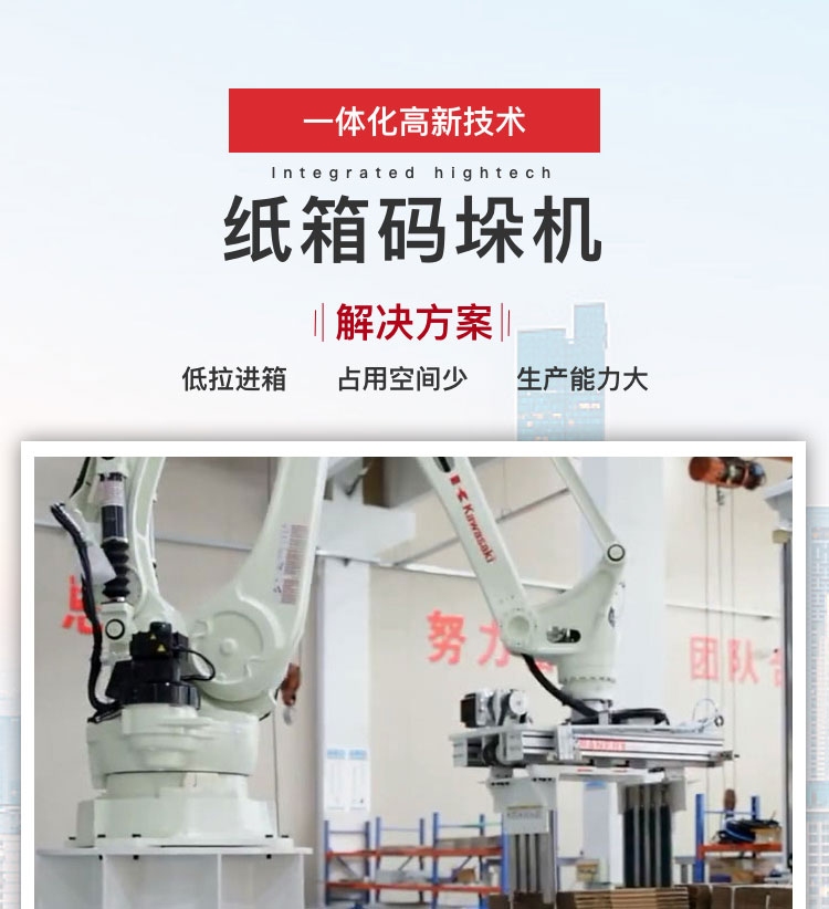 介紹:頂升抓取機構帶有置中、疊包功能,可配合前疊包平衡碼垛效率;專業設計的紙板夾具帶有鉤,可夾取放置一層或兩層紙箱防掉落;機器人采用四軸式Kawasaki機械手臂兼顧性能與成本,將紙箱按自定義的垛型自動碼放到托盤上。 產品別稱:紙箱碼垛機械手、自動流水線紙箱碼垛機、紙箱碼垛、機器人紙箱碼垛、紙箱碼垛機器人