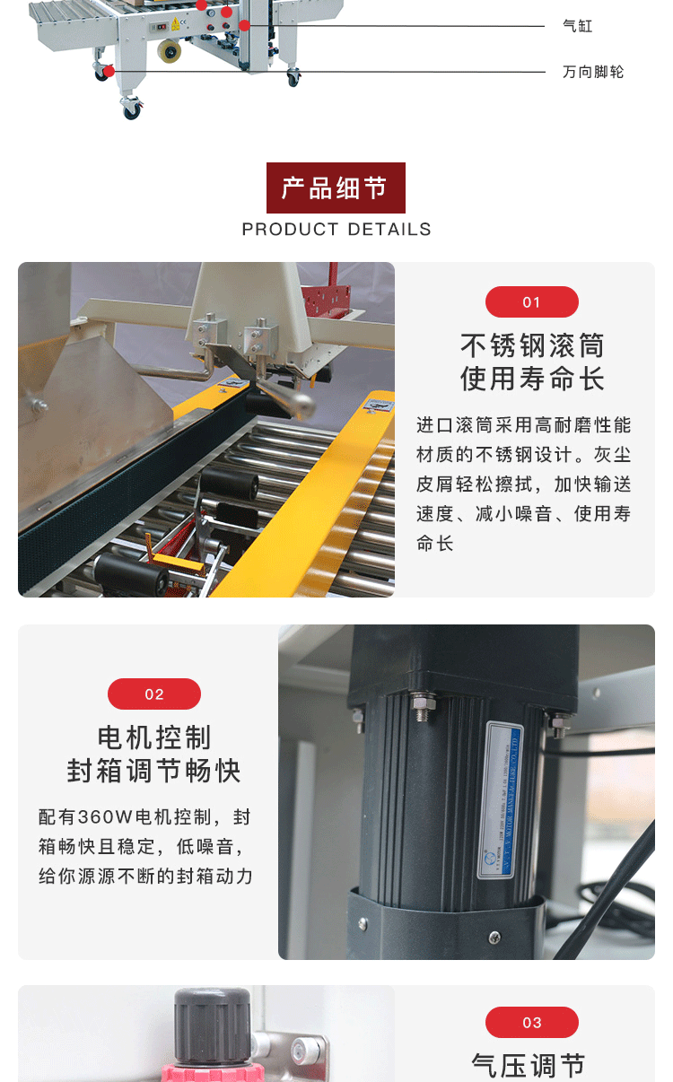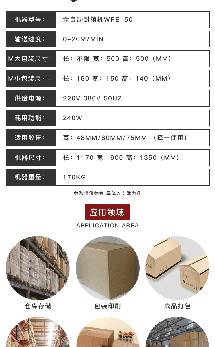 介紹:全自動封箱機WRE-50可以自動調節紙箱高度及寬度,更換不同規格紙箱無需人工調節;推薦更換紙箱規格頻繁的用戶使用。 該款封箱機廣泛應用于食品、醫藥、玩具、煙草、日化、電子等行業。 產品別稱:全自動封箱機、工字封箱機、一字封箱機、十字封箱機、四角邊封箱機、上下驅動封箱機、左右驅動封箱機、快遞封箱機、電商封箱機、膠帶封箱機、快速封箱機、可調封箱機、伺服封箱機